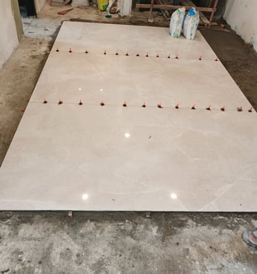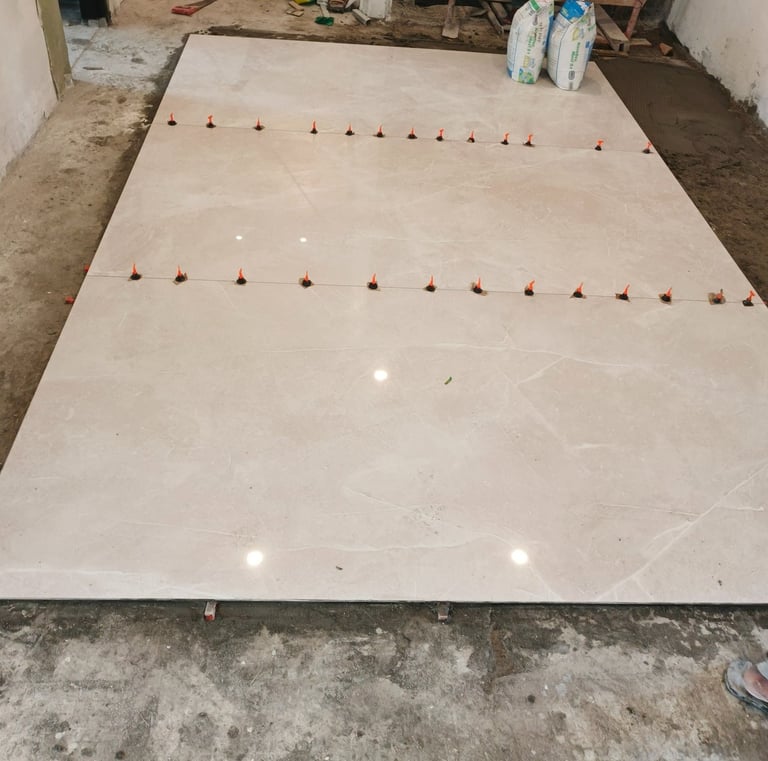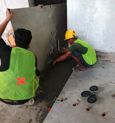 Pemasangan lantai dengan slab besar yang presisi.